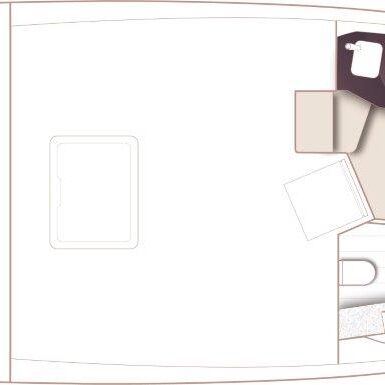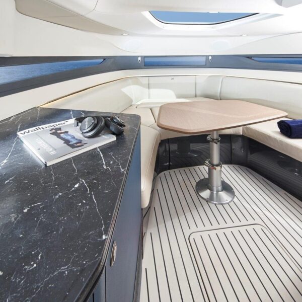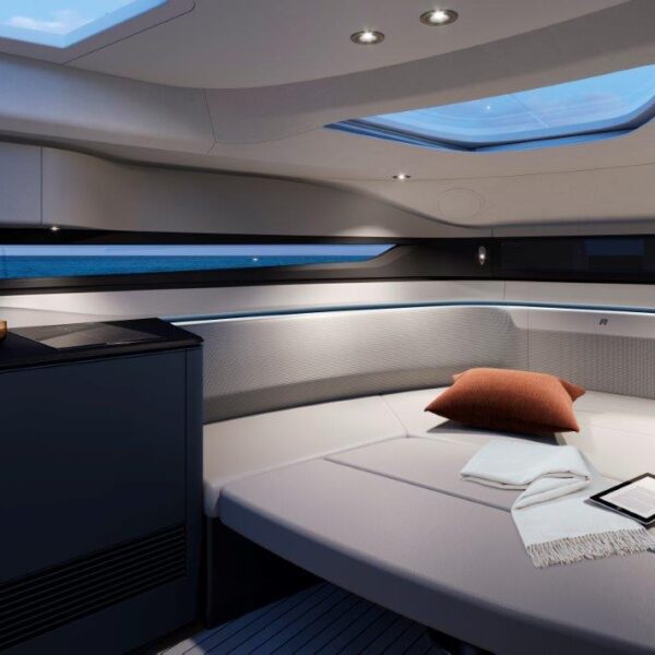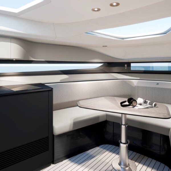 No interior, a Princess Design Studio adotou ideias novas e criativas. Materiais e técnicas tradicionais foram combinadas com técnicas de fabricação de vanguarda para proporcionar uma experiência inigualável para até 8 pessoas. Os assentos de leme com costura à mão tripla colocam você diante de telas de toque duplas sob medida de 17”, com as quais você controla todo o desempenho do motor e os dados de bordo. Abaixo do deck, as janelas envolventes com iluminação aeroespacial cuidadosamente selecionada envolvem uma tela inovadora que exibe uma vista panorâmica da proa. A bem equipada cozinha do iate é complementada com um sofá em forma de U e uma mesa de jantar, que pode ser convertida em um beliche duplo.