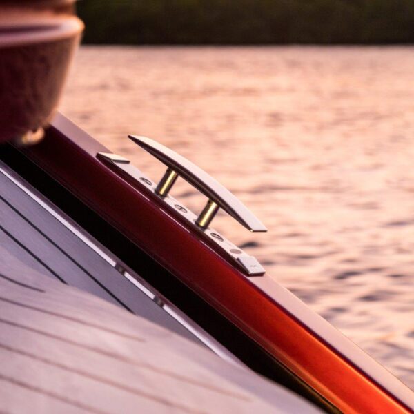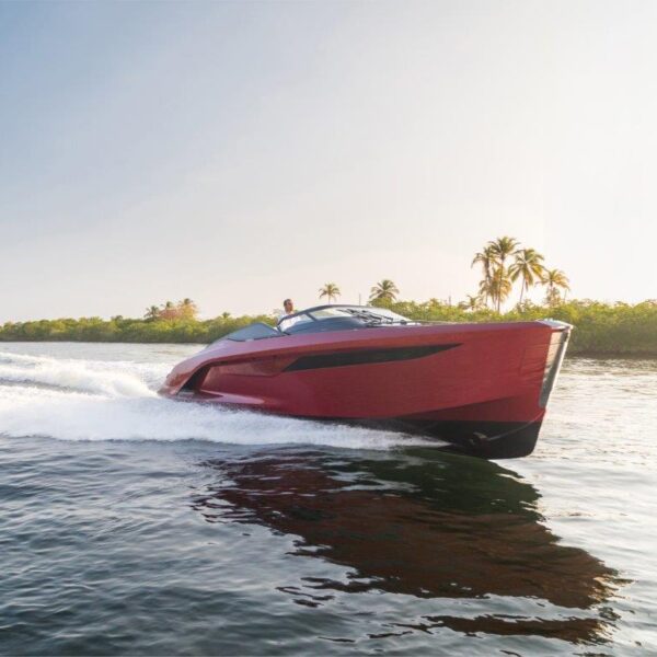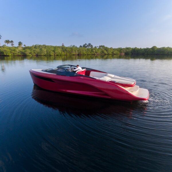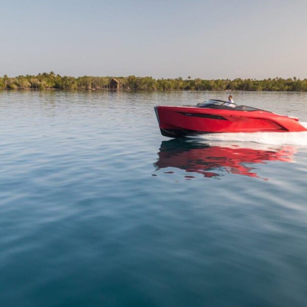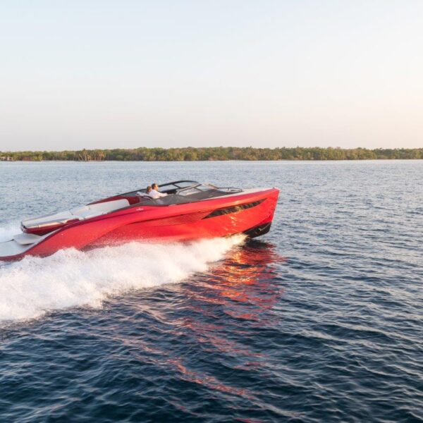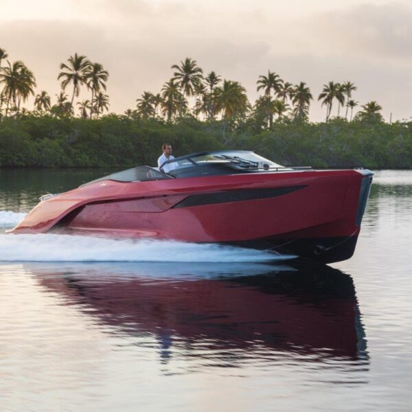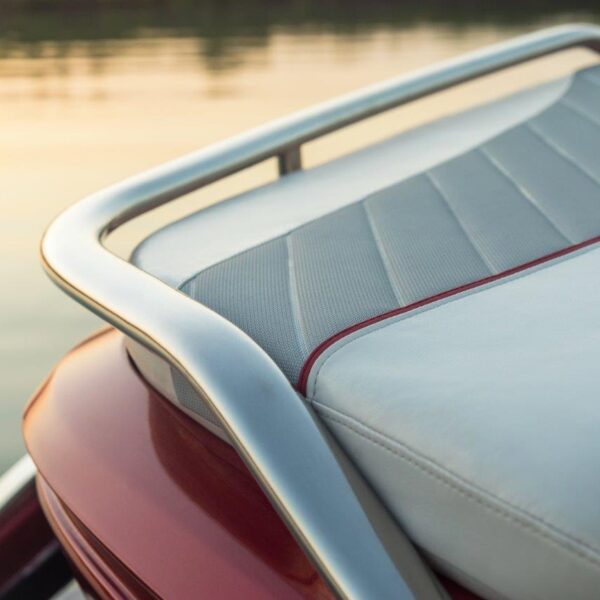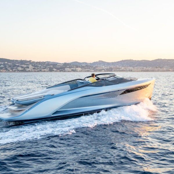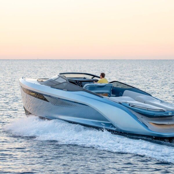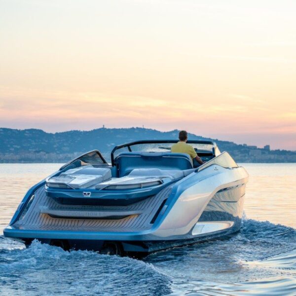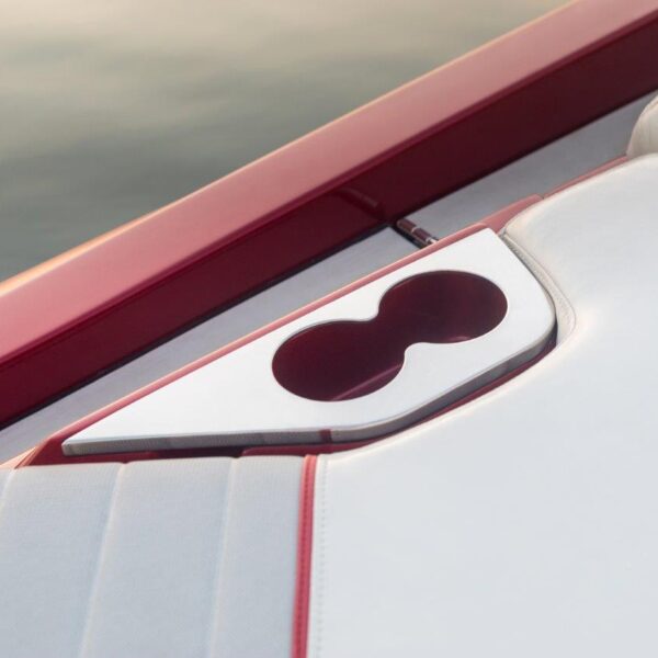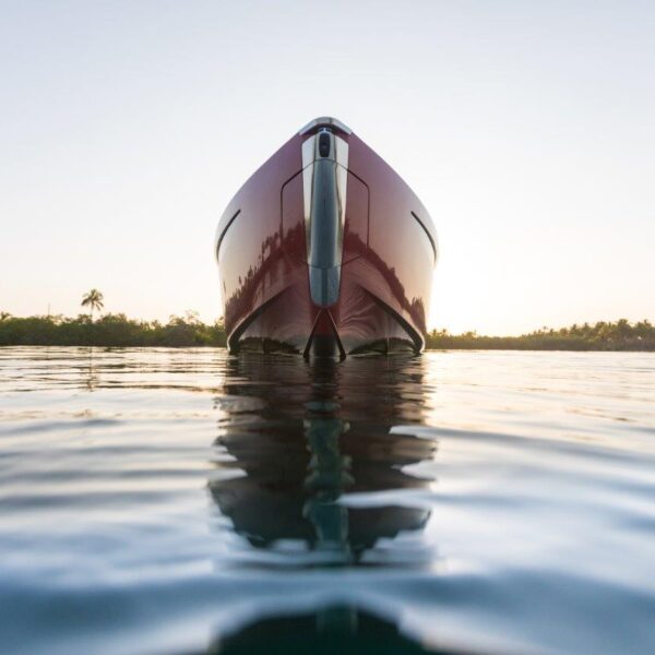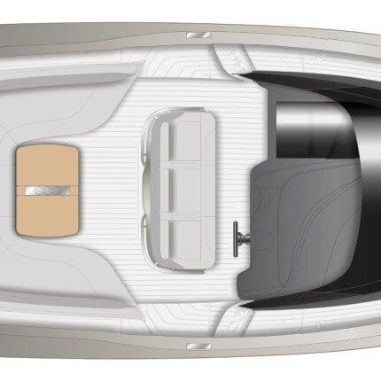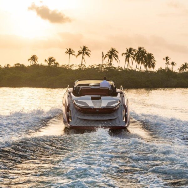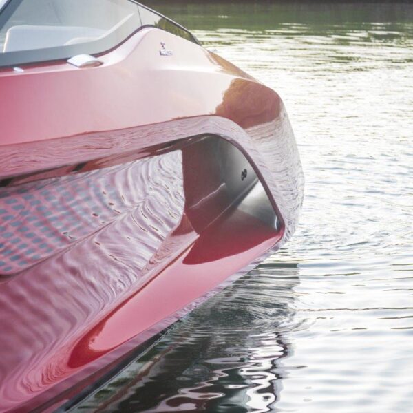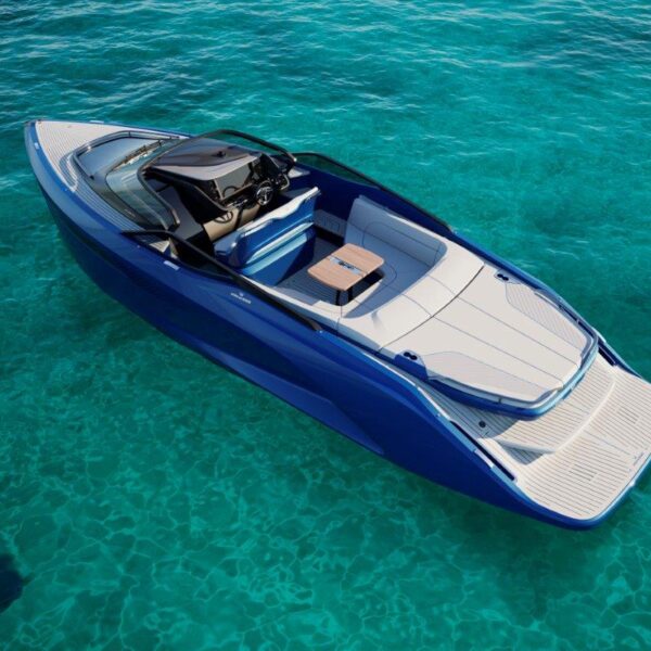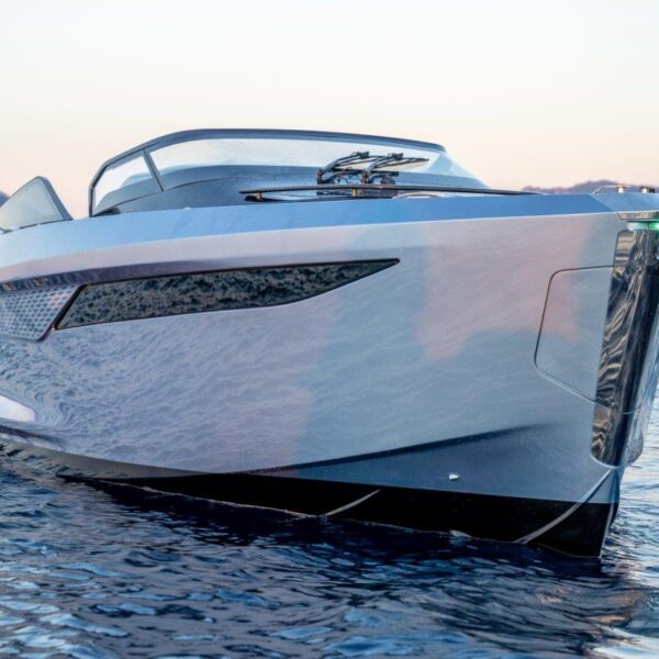 ajustadas aerodinamicamente no espelho de popa ajudam a suprimir todos os respingos de água (back spray) na popa do iate. Atrás do cockpit, espreguiçadeiras convidam você a aproveitar o sol, antes que você desça para a elegante plataforma de mergulho para se banhar.
