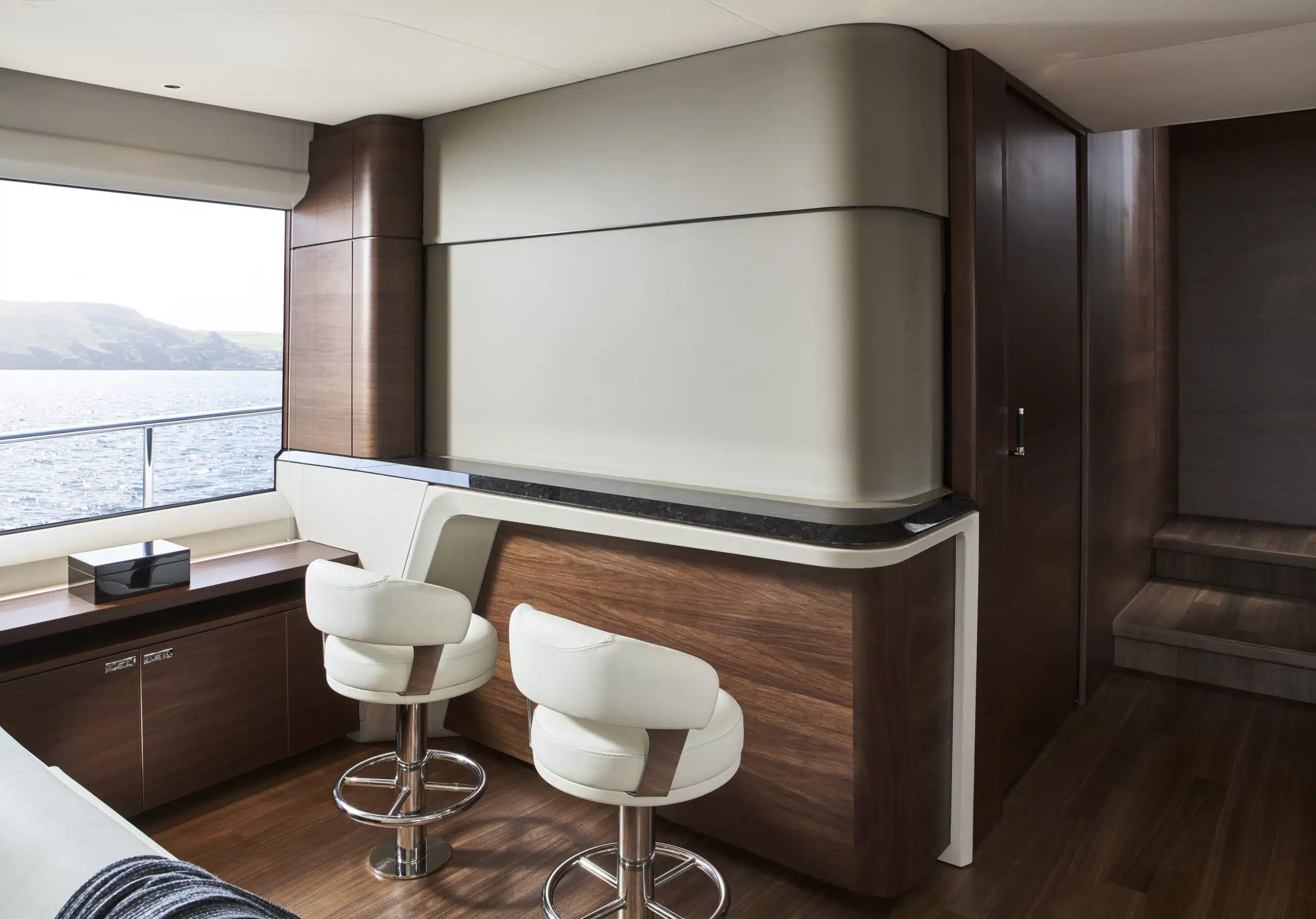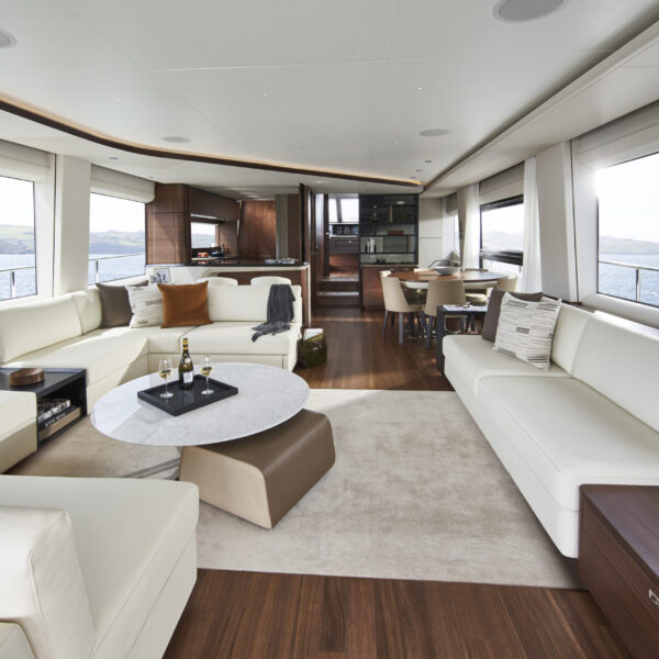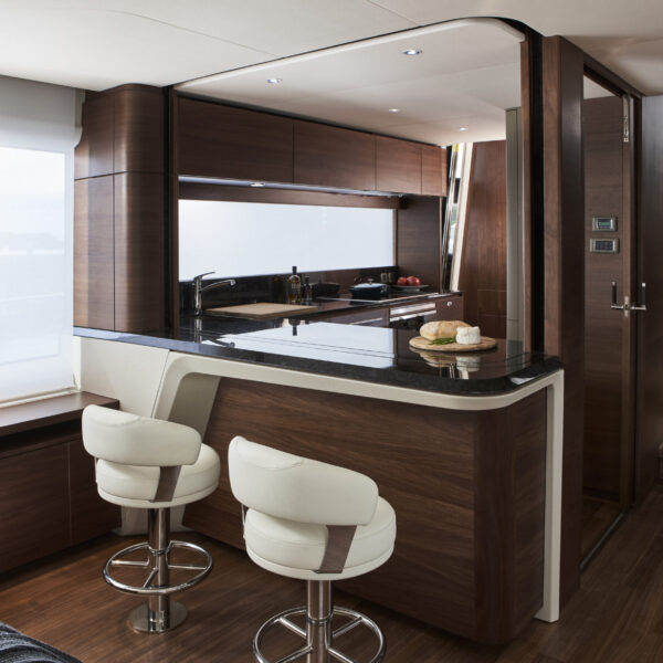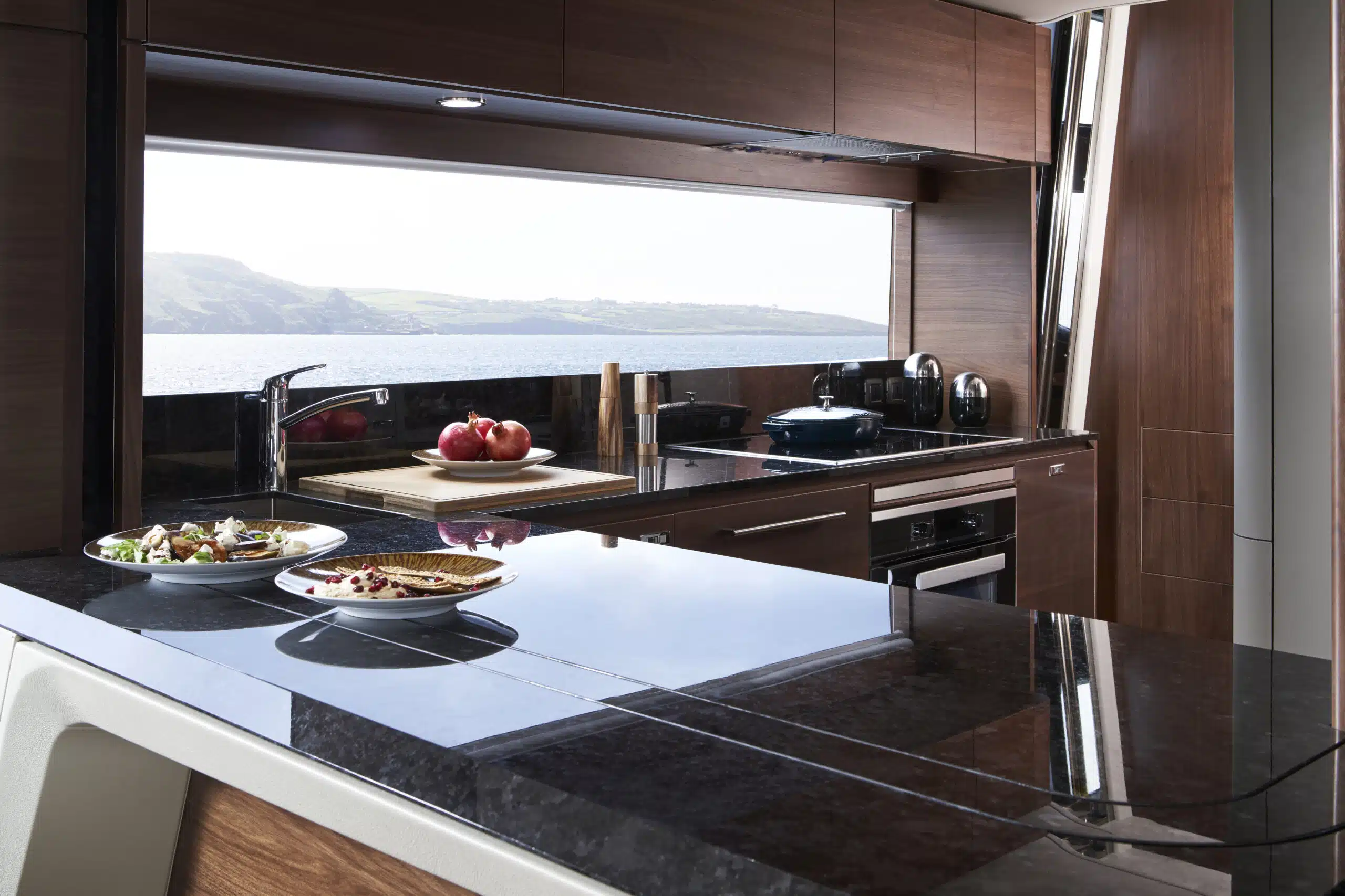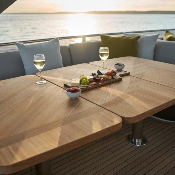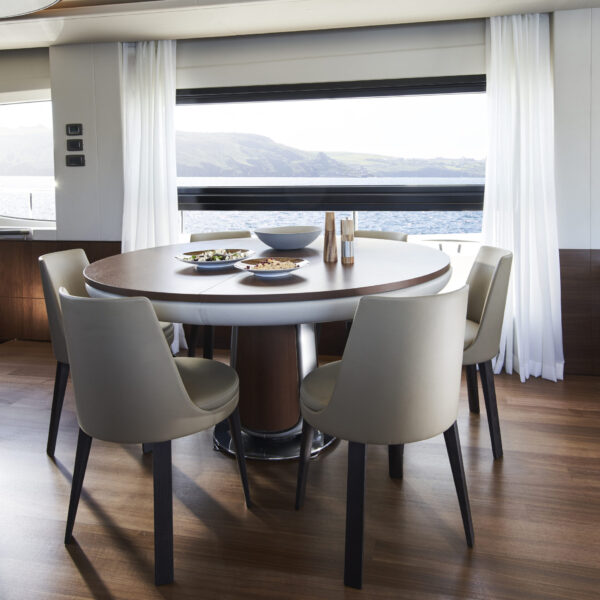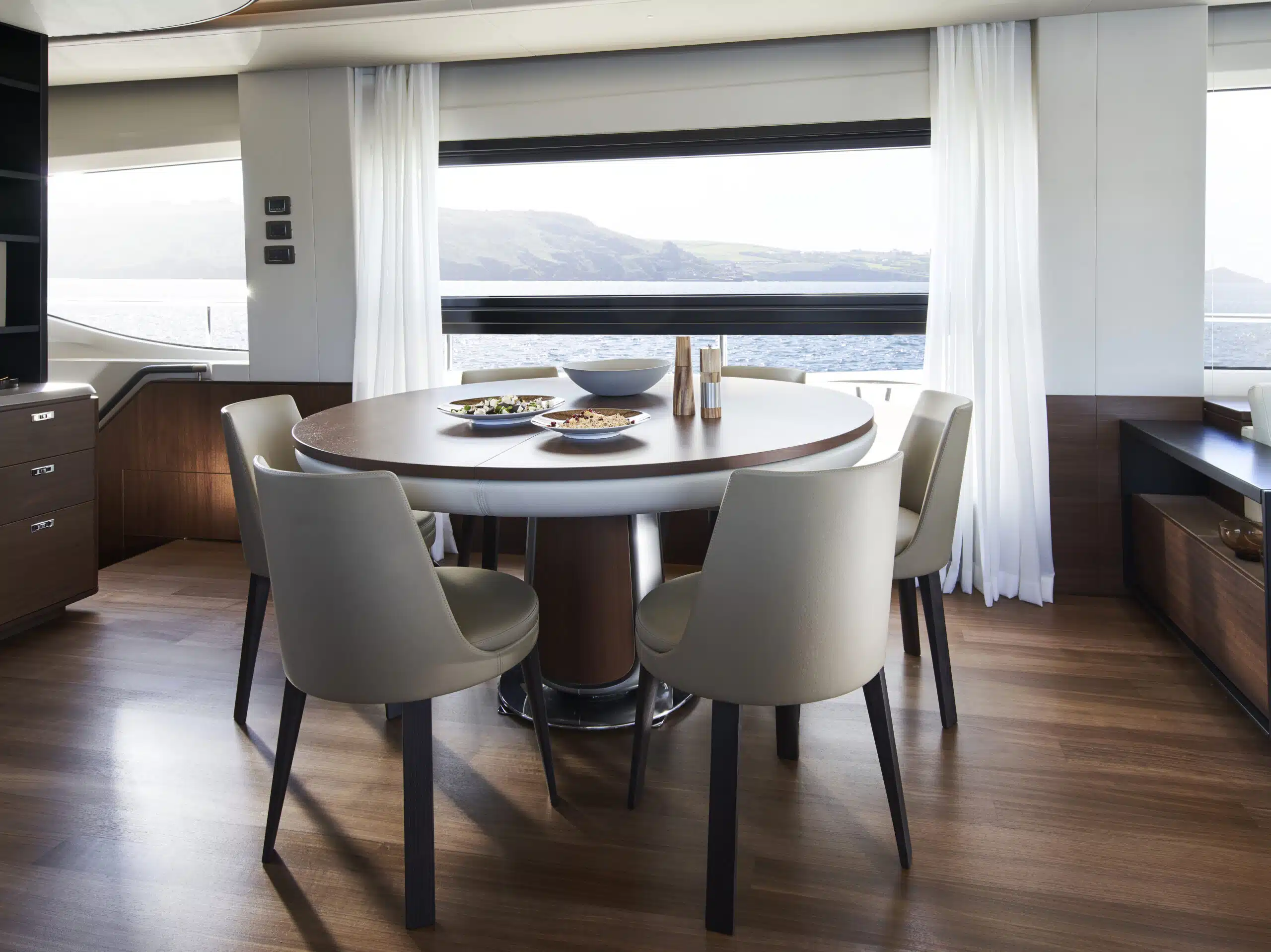 O convés principal alongado oferece amplos espaços de entretenimento, desde a grande área da cabine de pilotagem de popa disponível em uma variedade de configurações, incluindo uma mesa central da cabine de pilotagem ou arranjo de assentos conversíveis, até a área de jantar circular do salão para acomodar oito hóspedes. O arranjo flexível da cozinha permite uma maior privacidade aos hóspedes, e a tripulação pode deslocar-se discretamente pela embarcação.