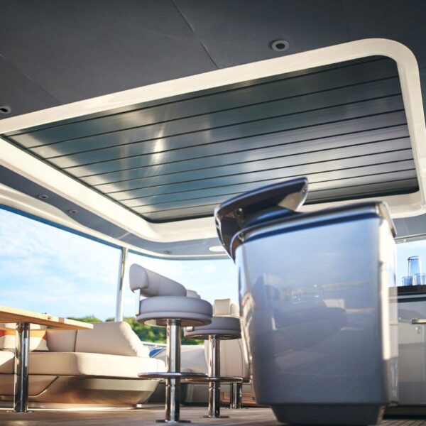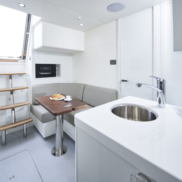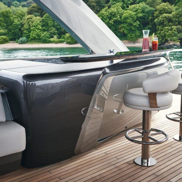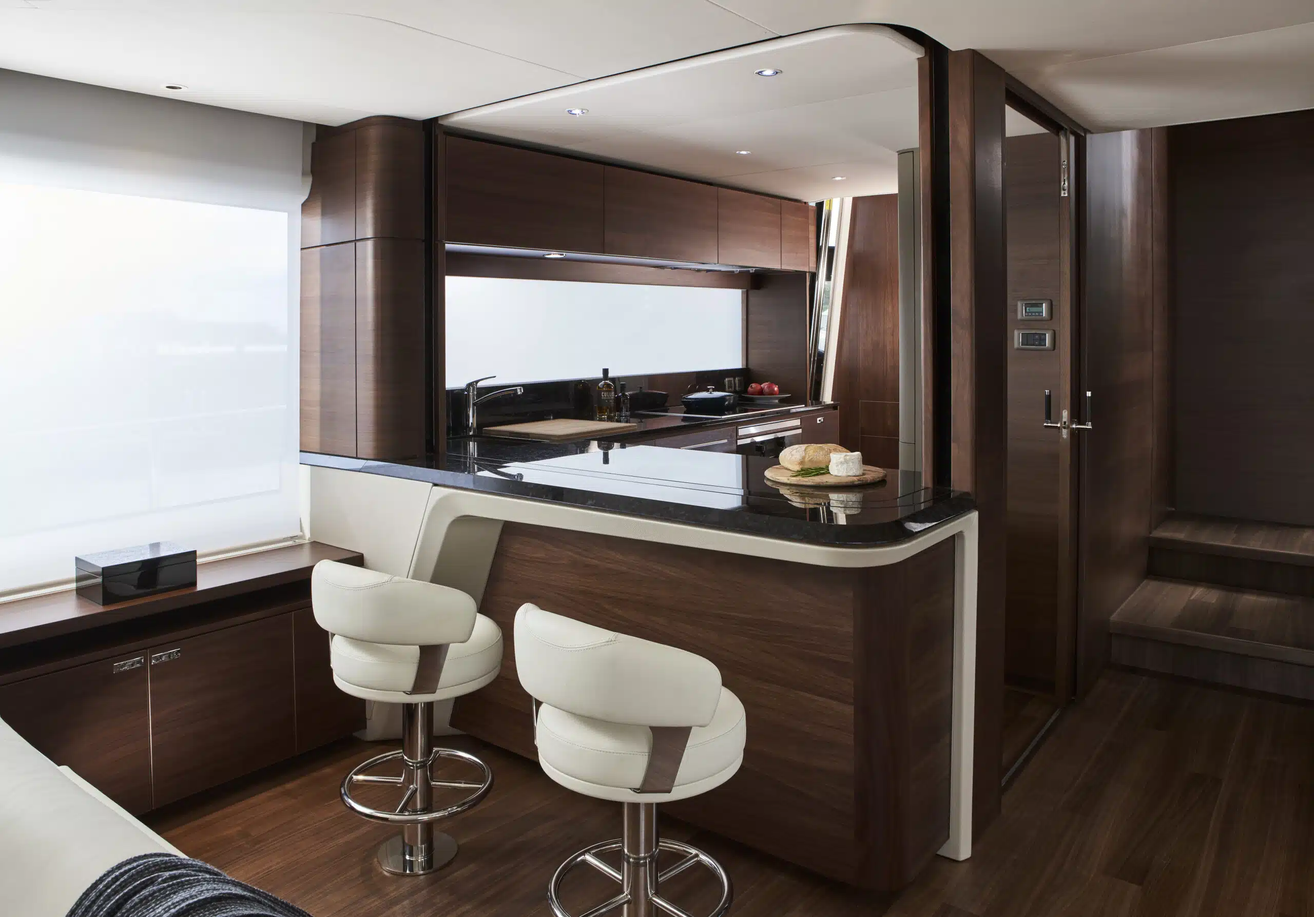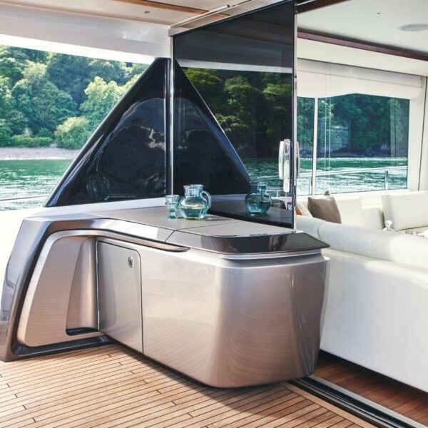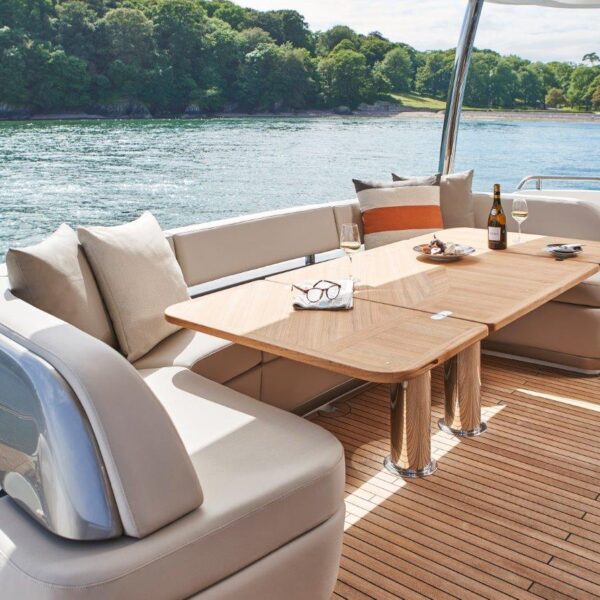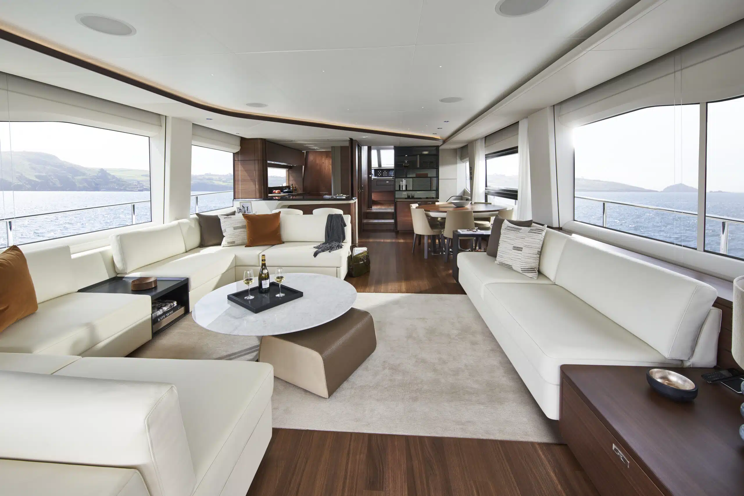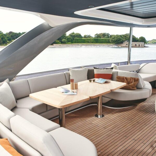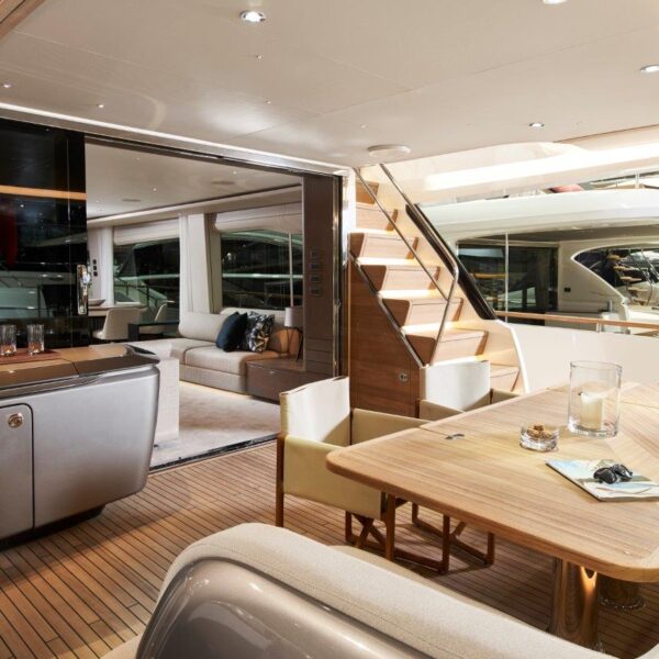 O convés principal alongado oferece amplos espaços de entretenimento, desde a grande área da cabine de pilotagem de popa disponível em uma variedade de configurações, incluindo uma mesa central da cabine de pilotagem ou arranjo de assentos conversíveis, até a área de jantar circular do salão para acomodar oito hóspedes. O arranjo flexível da cozinha permite uma maior privacidade aos hóspedes, e a tripulação pode deslocar-se discretamente pela embarcação.