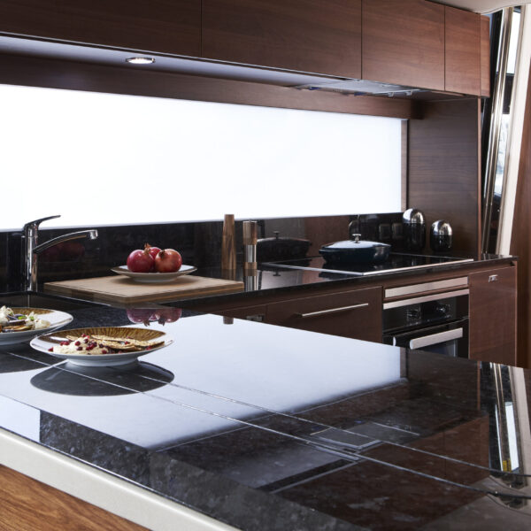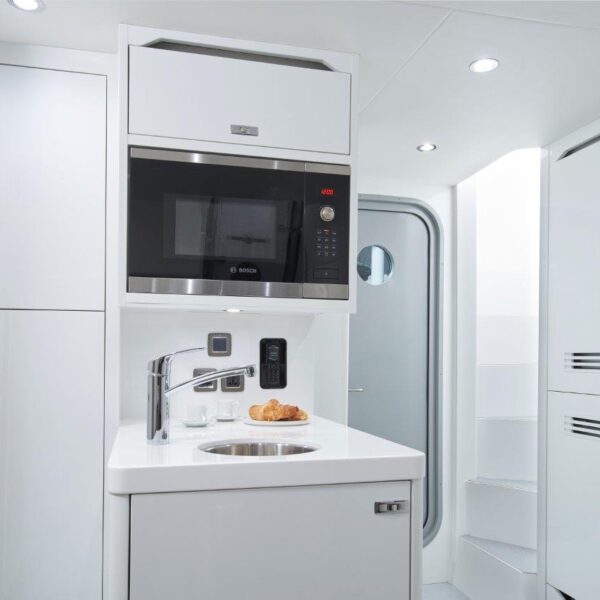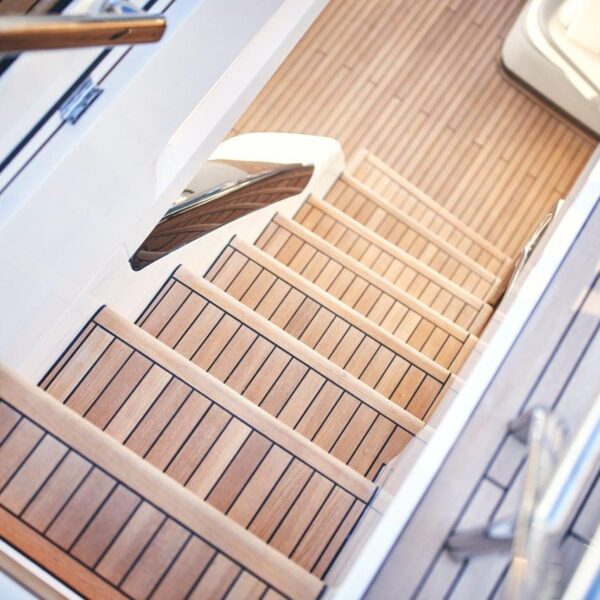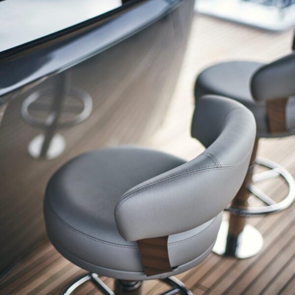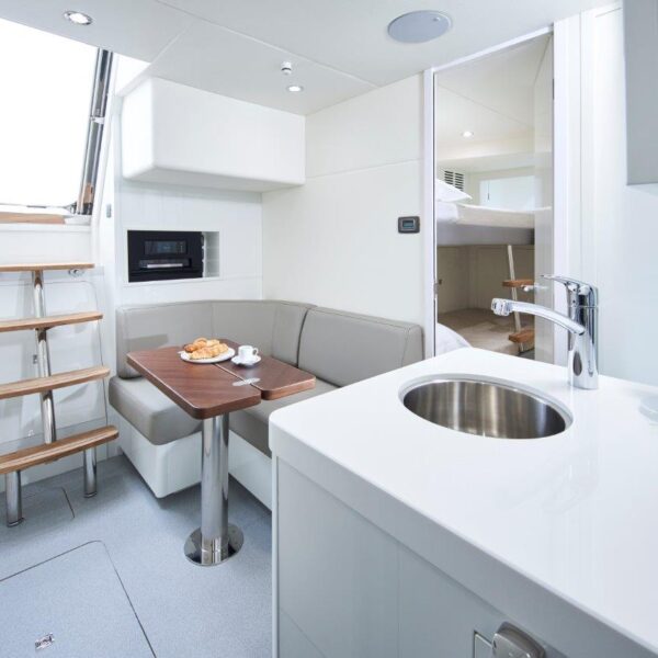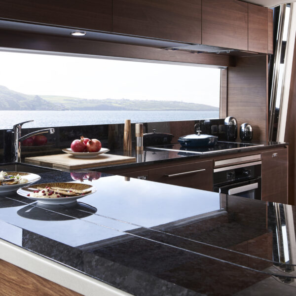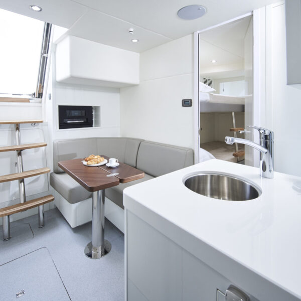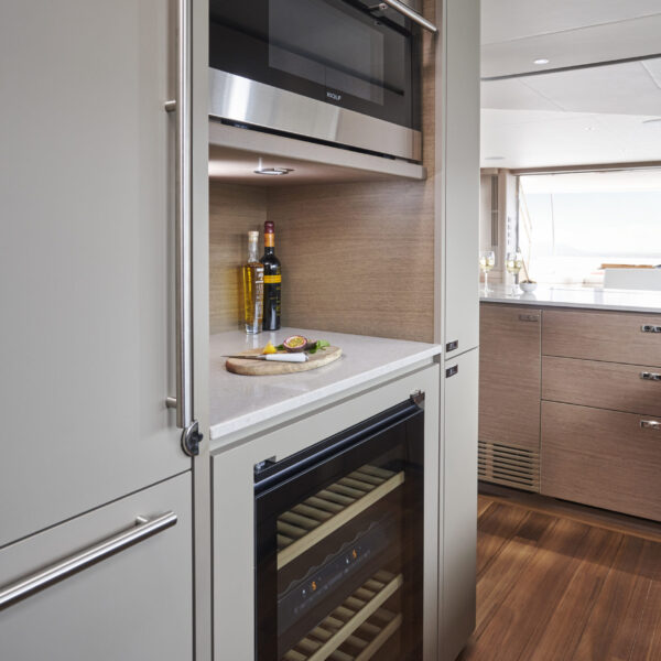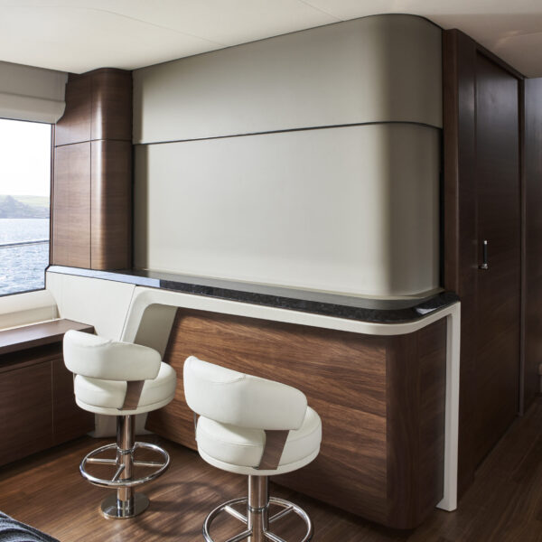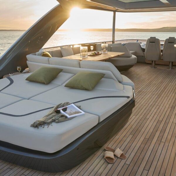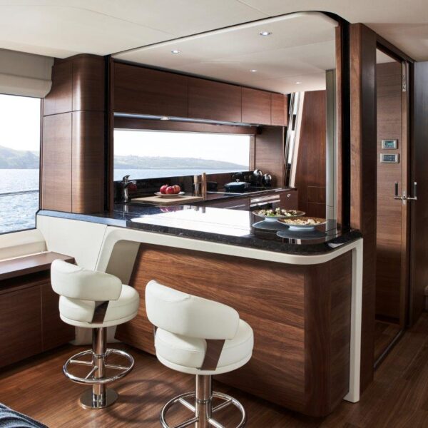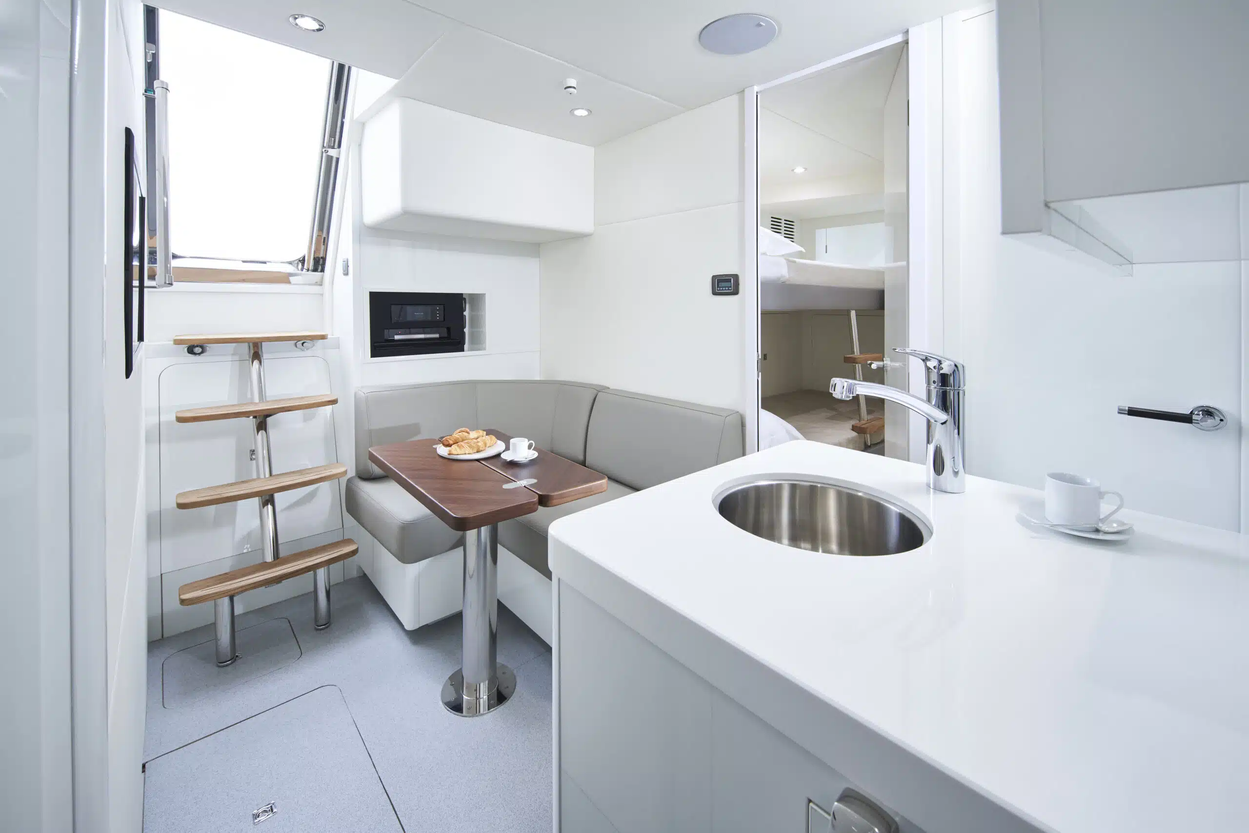 O convés principal alongado oferece amplos espaços de entretenimento, desde a grande área da cabine de pilotagem de popa disponível em uma variedade de configurações, incluindo uma mesa central da cabine de pilotagem ou arranjo de assentos conversíveis, até a área de jantar circular do salão para acomodar oito hóspedes. O arranjo flexível da cozinha permite uma maior privacidade aos hóspedes, e a tripulação pode deslocar-se discretamente pela embarcação.