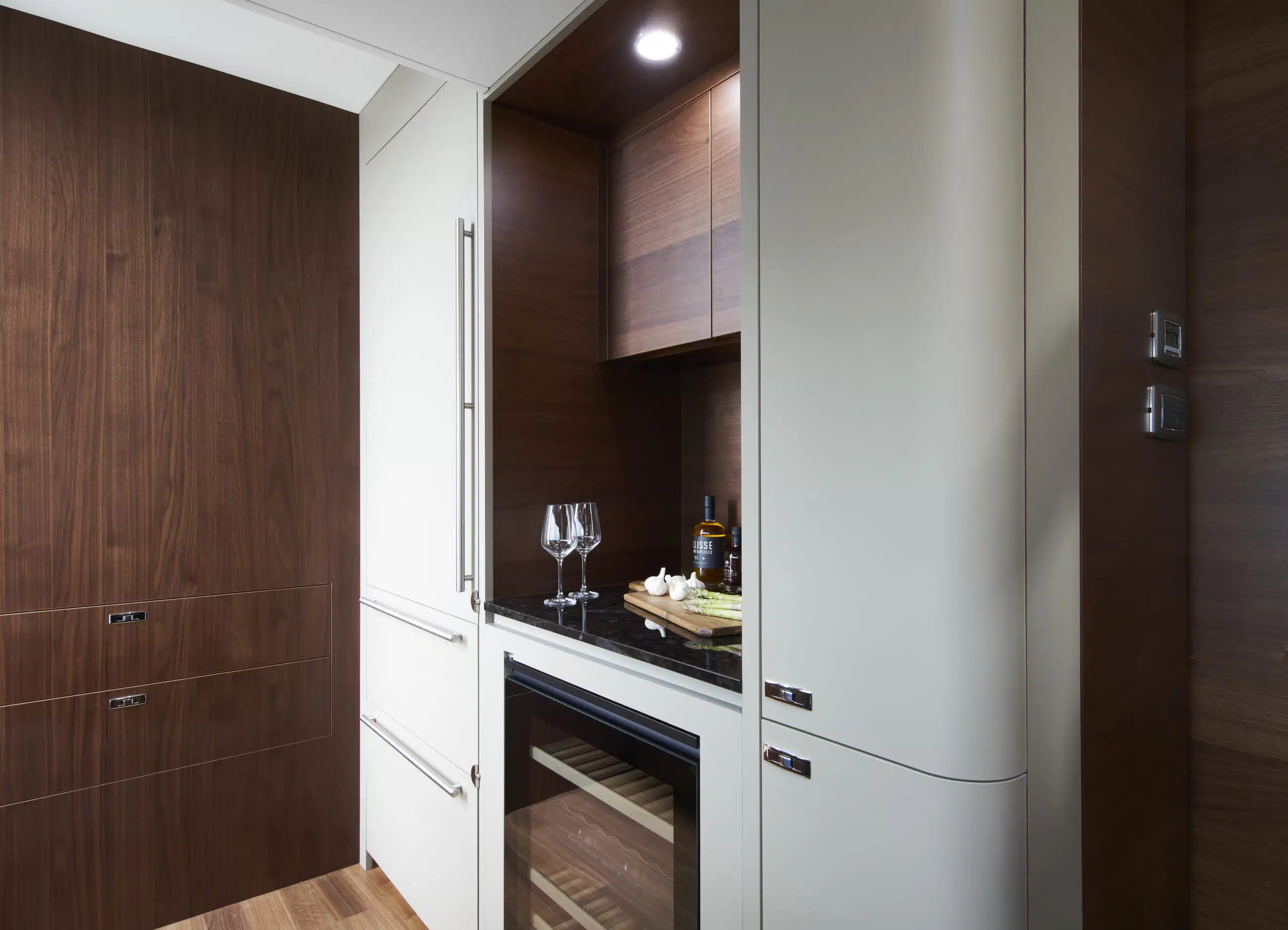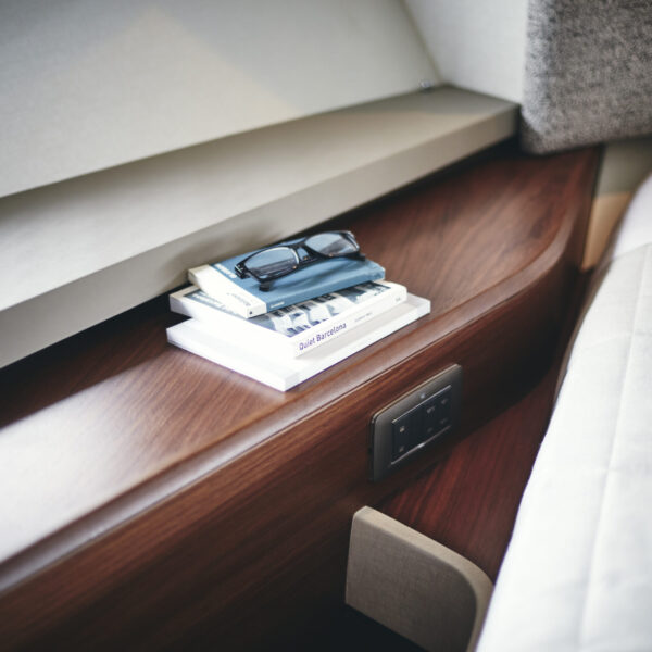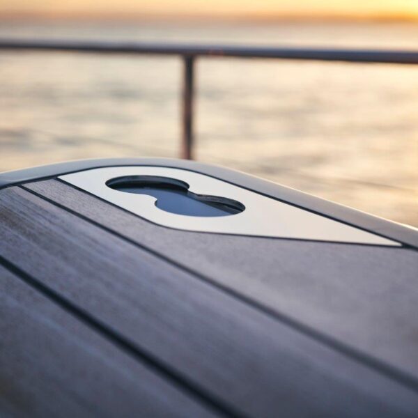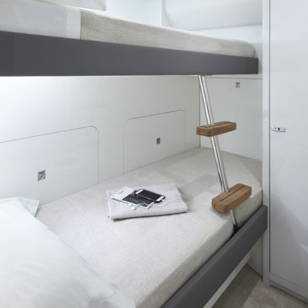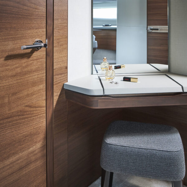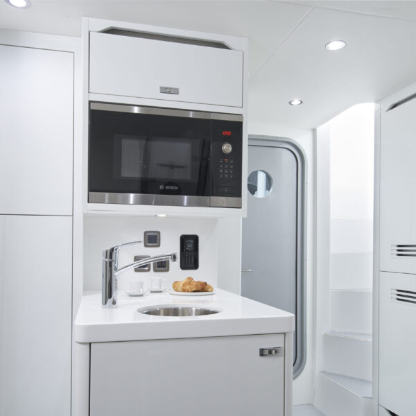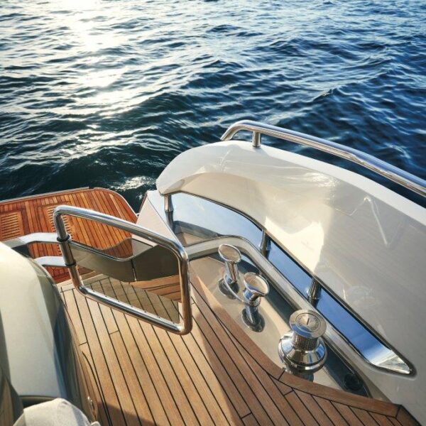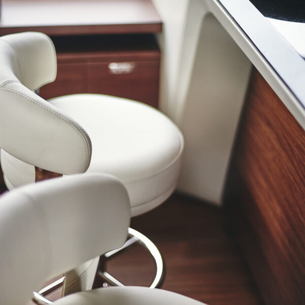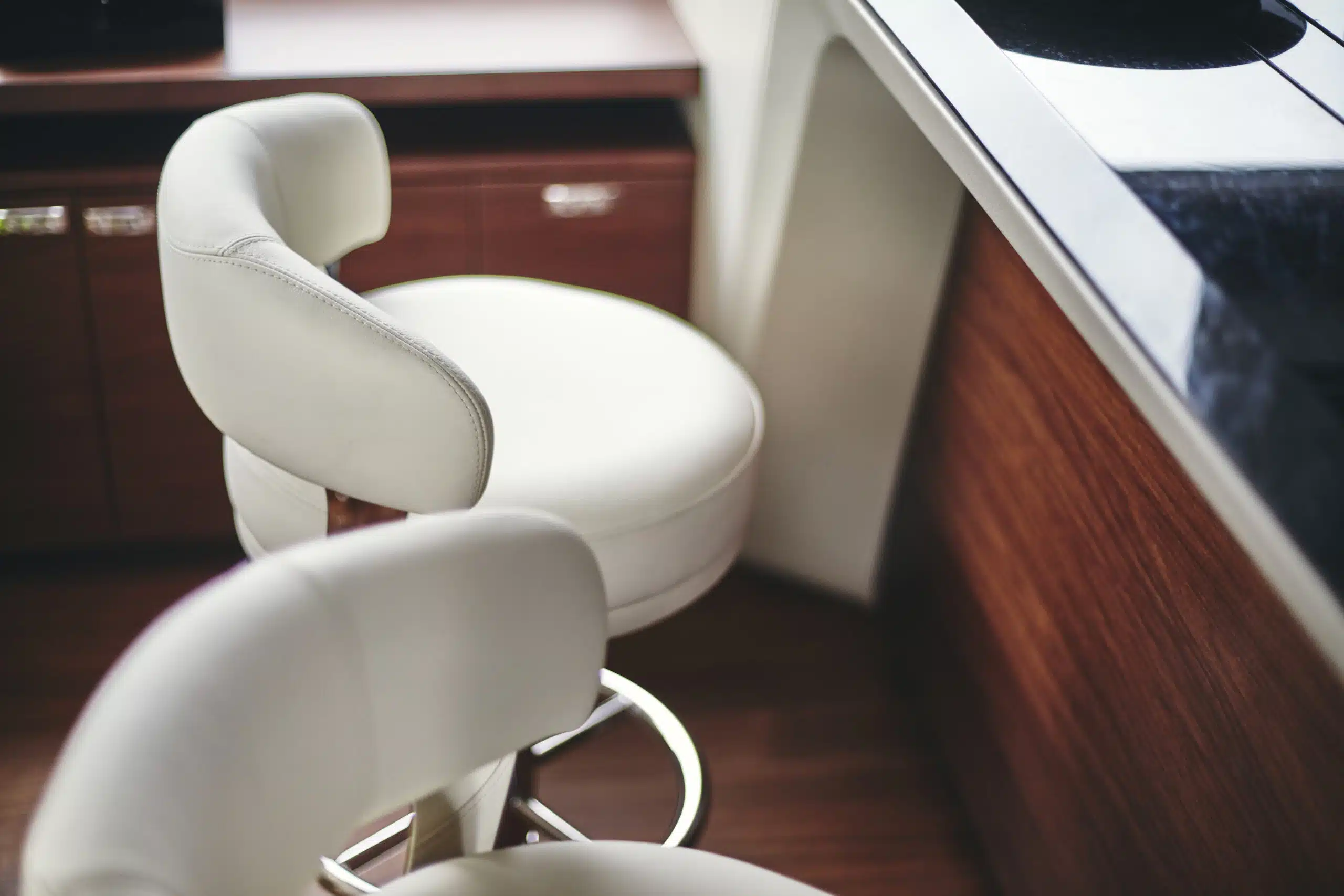 O convés principal alongado oferece amplos espaços de entretenimento, desde a grande área da cabine de pilotagem de popa disponível em uma variedade de configurações, incluindo uma mesa central da cabine de pilotagem ou arranjo de assentos conversíveis, até a área de jantar circular do salão para acomodar oito hóspedes. O arranjo flexível da cozinha permite uma maior privacidade aos hóspedes, e a tripulação pode deslocar-se discretamente pela embarcação.